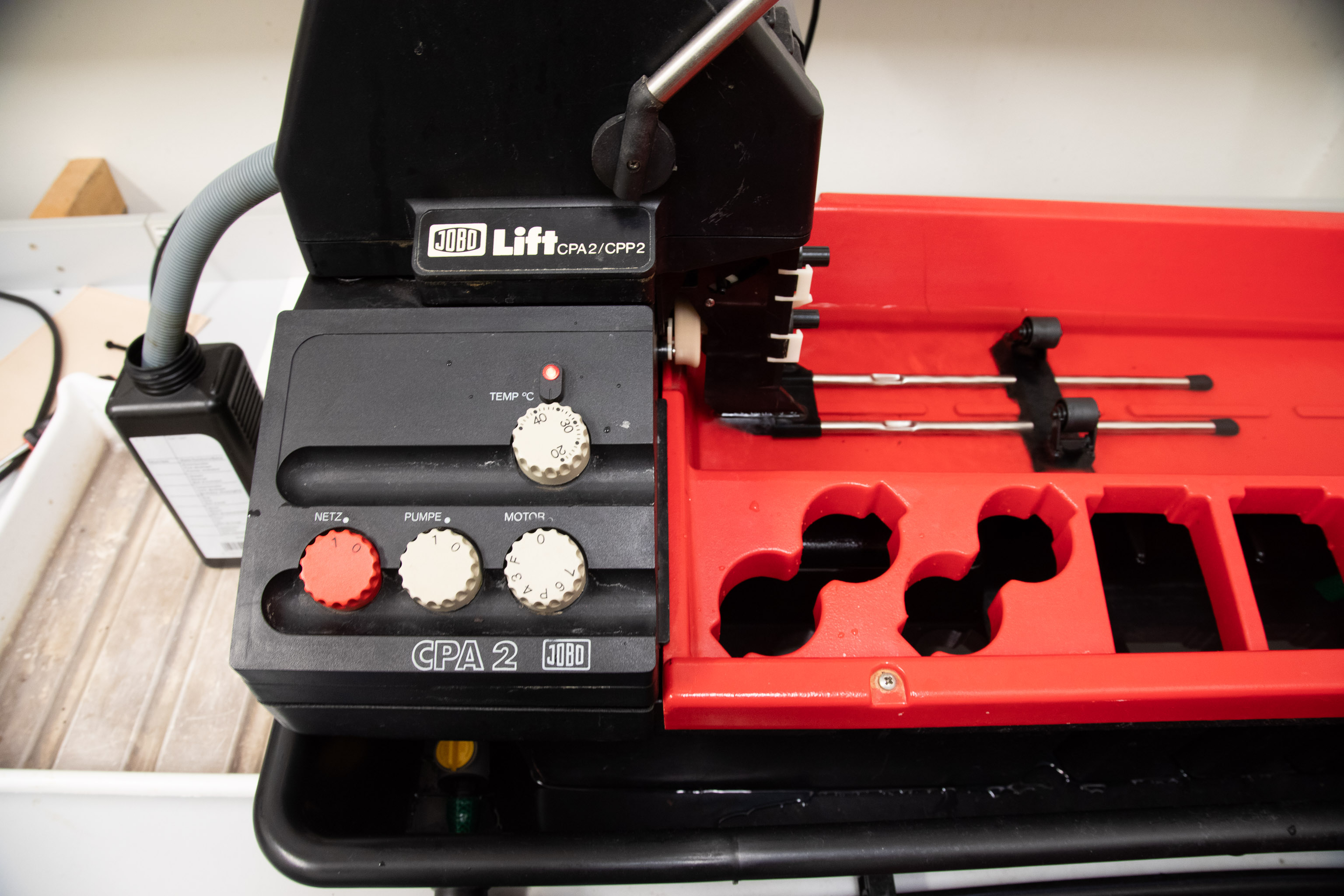 Used to control temperature, agitation, and timing. Includes a water bath, lift head, and control panel with temperature and motor speed knobs.