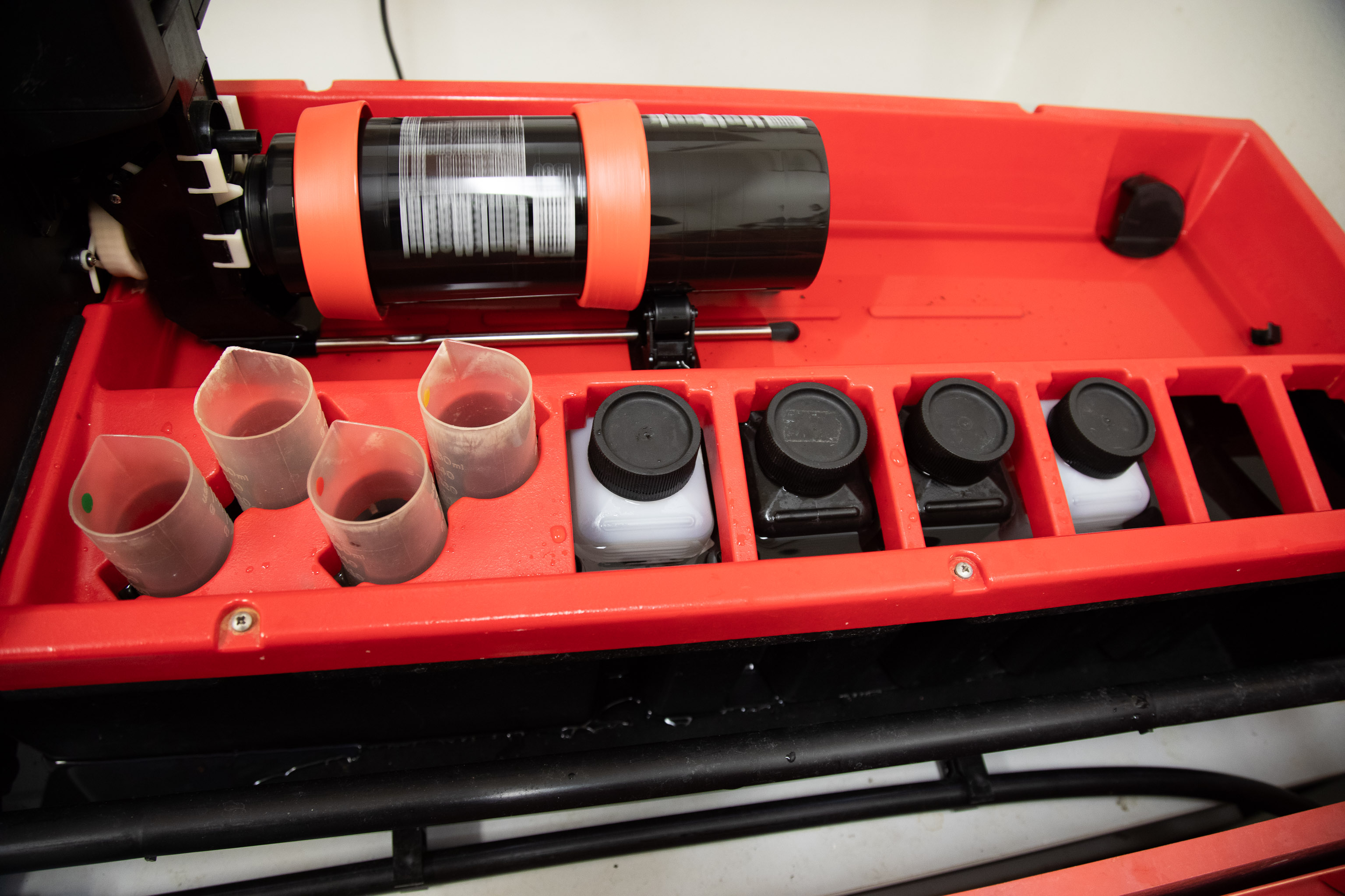 Fill the Jobo with water until the level reaches the center of the roller holder.