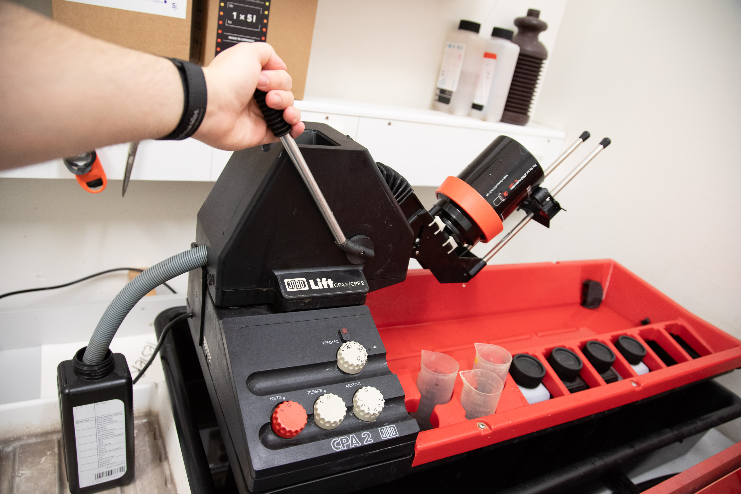 MOTOR 1) and set speed to F or 3 β suitable for color processing.Add chemicals through the lift head opening, in order: