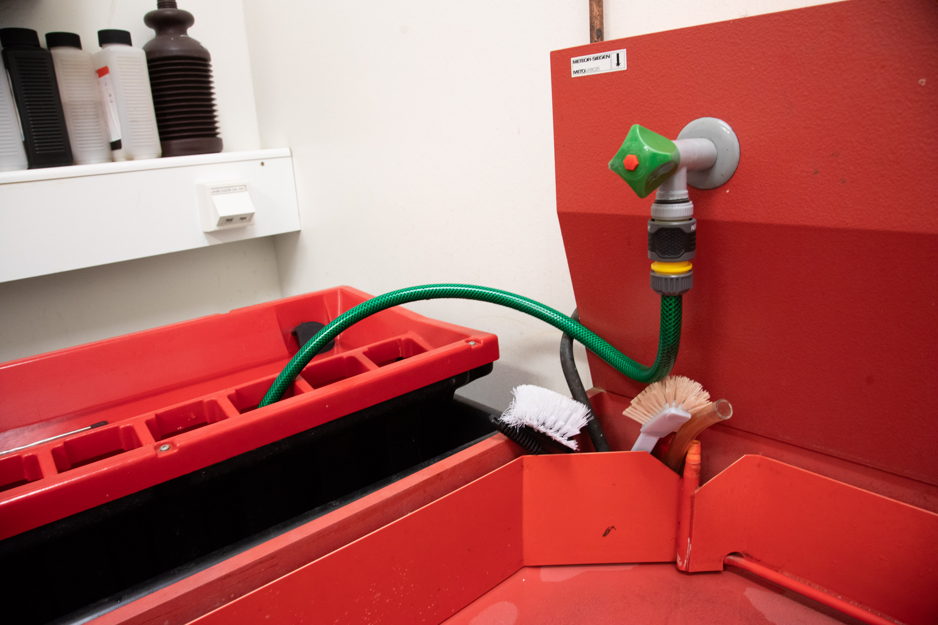 Keep a container ready to collect used chemicals from the output hose.